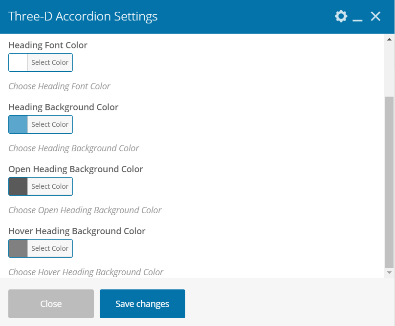 You can change heading font color, background color, open state heading background color, on hover heading background color.